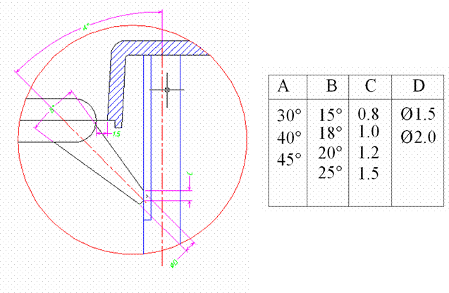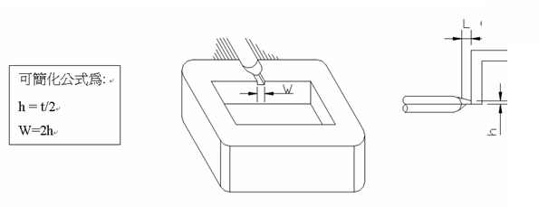 適用于大部塑料、各種側(cè)邊允許澆口痕跡的制品,開在制品的邊緣或邊緣頂面,又分標準入水、搭接入水和扇形入水,下圖中t為產(chǎn)品壁厚,L一般為(0.8—1mm)